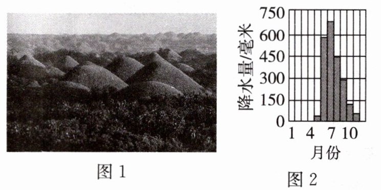 菲律宾薄荷岛中部丘陵上的草在雨季时为绿色,旱季则被炎热的太阳晒干变成咖啡色,酷似巧克力,因此得名“巧克力山”。下面图1为“巧克力山”景观图,图2为薄荷岛多年平均各月降水量柱状图。据此回答12~13题。