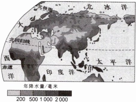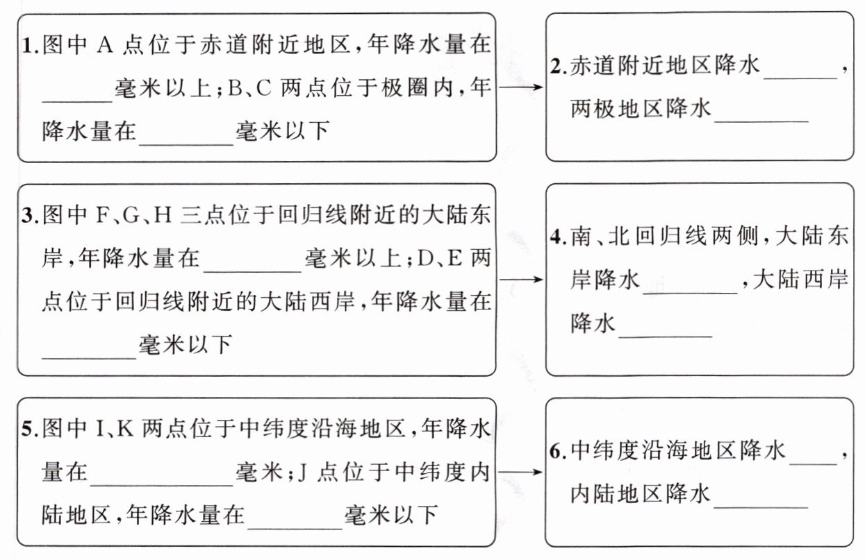 |1. 图中A点位于赤道附近地区,年降水量在______毫米以上;B、C两点位于极圈内,年降水量在______毫米以下|2. 赤道附近地区降水______,两极地区降水______|