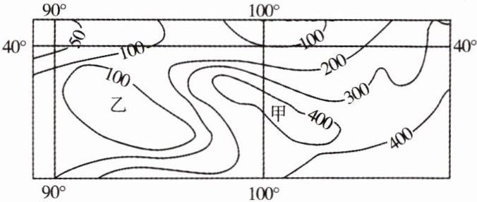 1. 读下面等降水量线图,甲地和乙地的年降水量分别是( )