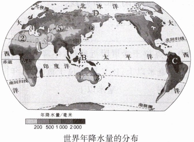 (1)A、B、C D 赤道附近地区降水较多,两极地区降水较少;