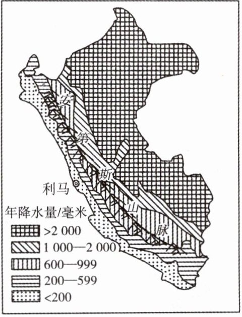 6. 读秘鲁年降水量分布图,关于该国年降水量分布特点的说法,正确的是( )