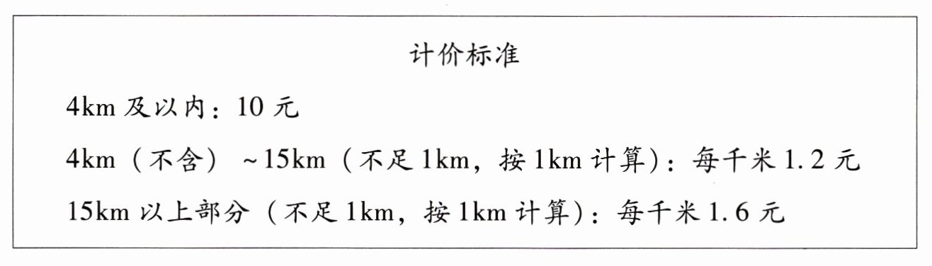 答案:$10+(15 - 4)×1.2+(50 - 15)×1.6$