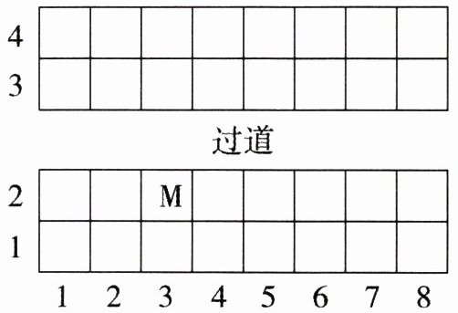 解析:本题考查用数对表示位置的知识点。数对的前一个数字表示列,后一个数字表示行。已知汽车A和汽车M在同一列,汽车M的位置是$(3, 2)$,即在第3列,那么汽车A也应在第3列。