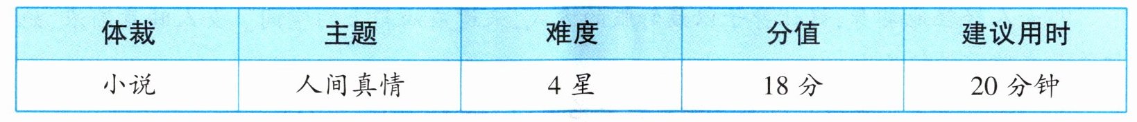 5.①女人生火做饭,和孩子视频通话 ②女人心疼男人和油钱,决定晚上睡在油箱上(每空1分)6.不要。(1分)理由:“女人决定和男人一同跑车”的内容属于插叙;交代了女人和男人一同跑车的原因,使文章情节更完整;使人物形象更丰满,突出男人的辛苦、女人的心疼;同时让文章结构富于变化,避免了平铺直叙。(理由每点1分,答出任意三点即可)7.自责,自己没看住油;(1分)感动,男人不但没有责怪反而安慰她;(1分)难受,又损失了几百块钱;(1分)心疼,男人经常会遇到危险。(1分)8.设置悬念,激发读者阅读兴趣;油箱是贯穿全文的线索;概括了文章的主要内容,女人心疼男人和油钱,夜里睡在油箱上看护油箱(交代了文章的主要人物);暗含了对女人不怕吃苦、心疼男人的赞美之情。(每点1分,共4分)9.示例:我选择C,因为跑车夫妻的辛苦让人心酸,汽油被盗的遭遇让人同情,这与灰色所表现的凄凉、伤感相似;(2分)但男人和女人在艰苦的条件里,不怕吃苦、相互关心、彼此温暖,这与橙色的温暖色调相符。(2分)所以,海报的主色调由灰色渐变为橙色最好。