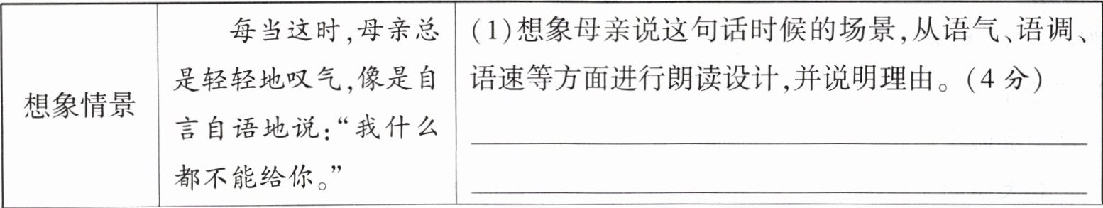 (1)朗读“每当这时,母亲总是轻轻地叹气”时,语气应该带有淡淡的无奈和叹息,语调稍微低沉,语速放缓,以表现出母亲内心的失落感。(2分)朗读“像是自言自语地说:‘我什么都不能给你。’”时,语气应该更加柔和,带有自责和无奈,语速平缓,以表现母亲内心的挣扎和无力感。(2分)