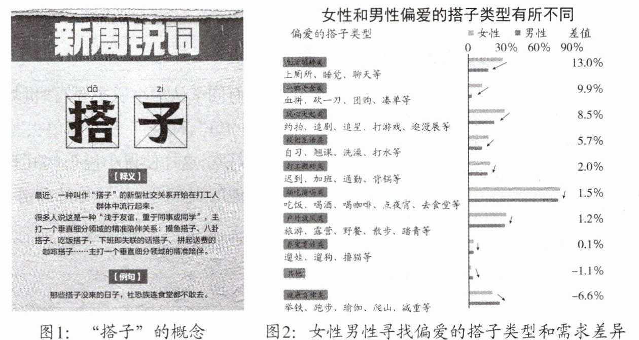 6. 请根据材料二图2,从女性男性“偏爱的搭子类型”和“需求差异”两个角度各提炼出一条有效信息。(4分)
