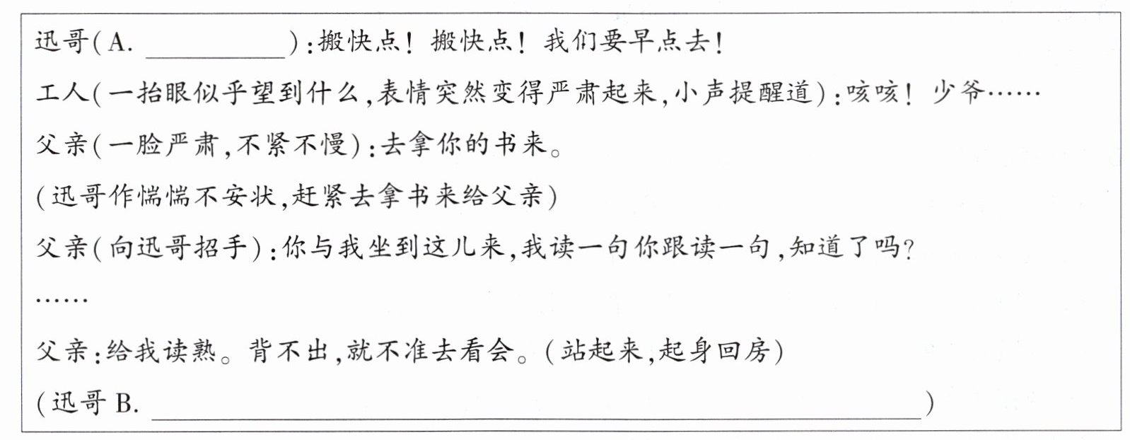 1. 某班同学阅读完《朝花夕拾》后,打算将其中《五猖会》改编成话剧,请你根据《五猖会》内容,将括号内的舞台说明补充完整。(提示:舞台说明一般用于指出人物说话的语气、说话时的动作、说话时的表情等)(4分)