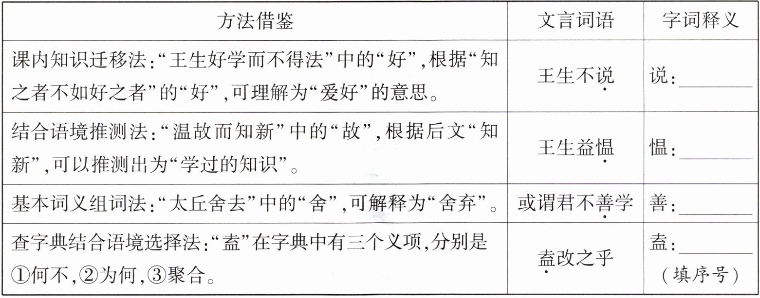 1. 参考表格提示的方法,解释下列加点词,只写词义。(4分)