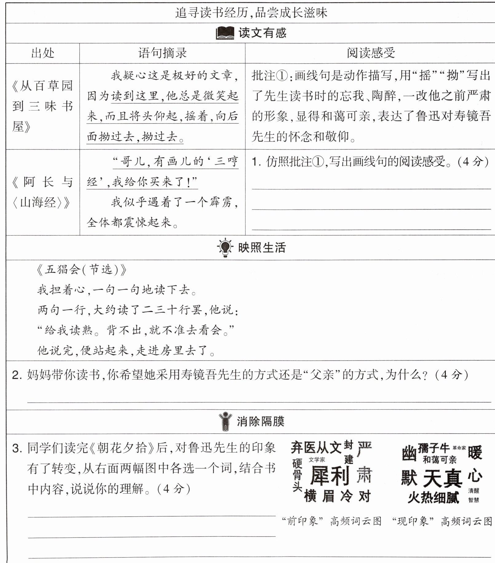 班级开展《朝花夕拾》专题探究活动,请根据你的阅读体验,完成《朝花夕拾》阅读单。