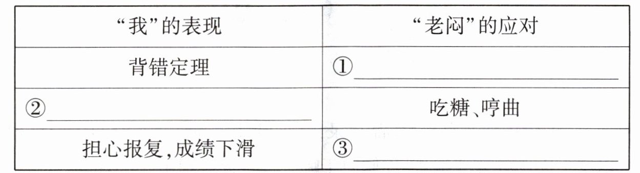 5. 文章着重叙写了“我”与“老闷”的几番“交锋”,阅读全文,完成下列表格。(3分)