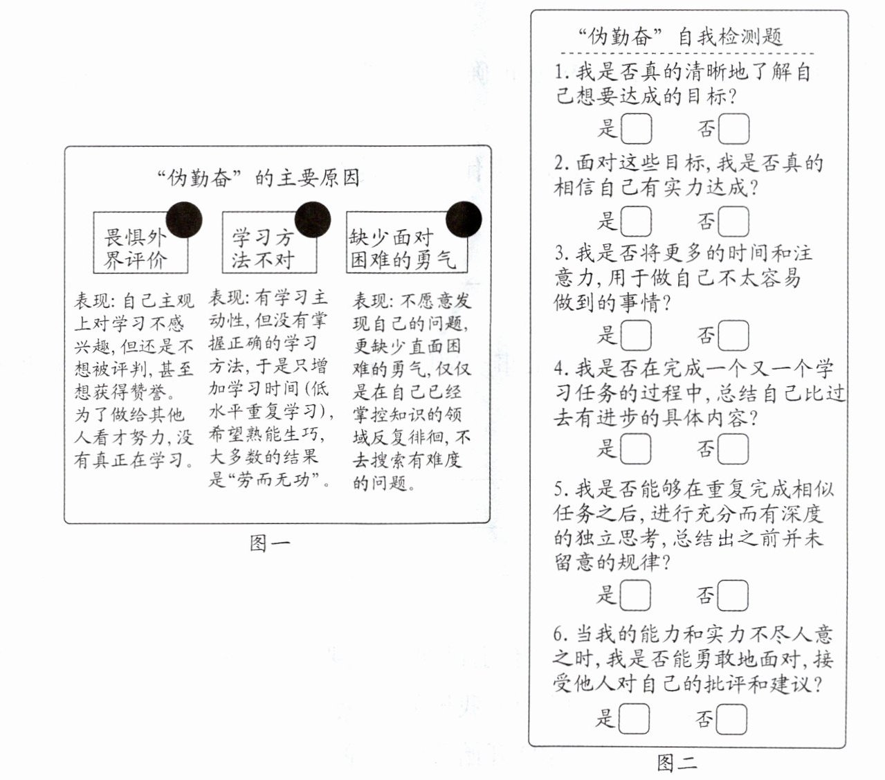 你是否陷入“伪勤奋”的怪圈呢?可使用“‘伪勤奋’自我检测题”(见材料一图二)检验一下,否定答案愈多说明你在“伪勤奋”的陷阱里陷得愈深。下面介绍两招,助你彻底告别“伪勤奋”。
