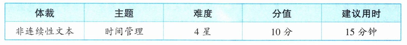 示例:①利用日程本将每日待办事项按照“四象限法”分等级,优先完成重要且紧急的事项,这样就可以从容地将重要的事情做好;②善于利用零散时间,如利用食堂排队的时间背诵活动中需要的素材,既能缓解排队的无聊情绪,又能丰富自己的积累。