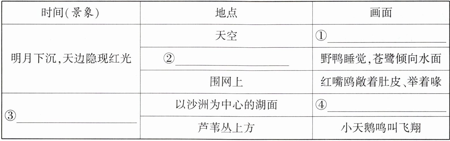 1.①灰鹤鸣叫着穿过红光 ②沙洲 ③太阳攀升,晨光染红沙洲 ④野鸭们苏醒后集会、戏水、鸣叫/野鸭们集体亮相(每空1分,共4分)