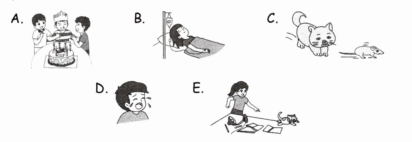 【解析】:本题主要考查根据英文句子意思匹配对应的图片。解题关键在于理解每个英文句子所表达的人物情绪或动物之间的关系,然后与所给图片进行对比。