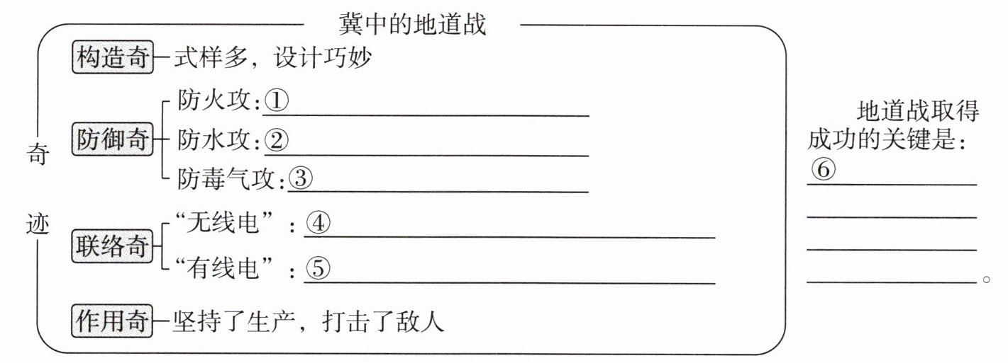 ①洞口准备土和沙 ②把地道和枯井暗沟连接起来 ③“孑口”上装吊板 ④一个接一个的吆喝声 ⑤拉响用铁丝牵住的小铜铃来传递信息 ⑥中国人民的智慧和保家卫国的顽强斗志