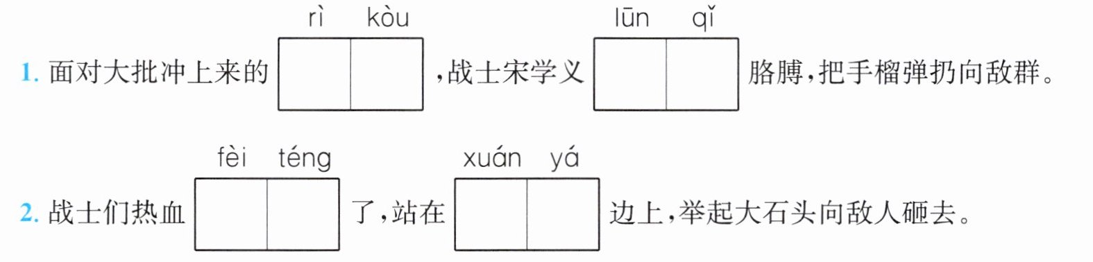 2. 战士宋学义扔手榴弹总要把胳膊抡一个圈,好使出浑身的力气。胡德林和胡福才这两个小战士把脸绷得紧紧的,全神贯注地瞄准敌人射击。