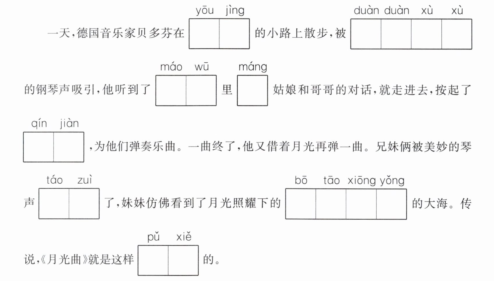 2. 月光照进窗子,茅屋里的一切好像披上了银纱,显得格外清幽。贝多芬望了望站在他身旁的兄妹俩,借着清幽的月光,按起了琴键。(