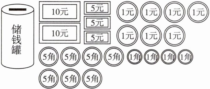 1. 统计方案:先分别数出$10$元、$5$元、$1$元纸币(或硬币)的数量,再分别数出$5$角、$1$角硬币的数量,然后根据“$总金额 = 10元面值×10元数量 + 5元面值×5元数量+1元面值×1元数量 + 5角面值×5角数量+1角面值×1角数量$”来计算总金额。