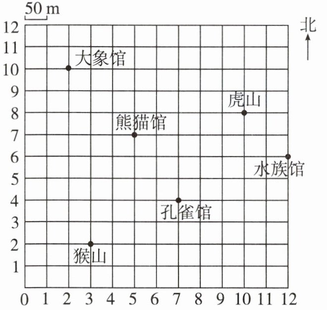 1.(10,8) 100 北 100 2.图略 (1,5) 3.猴山→熊猫馆→孔雀馆→虎山→水族馆