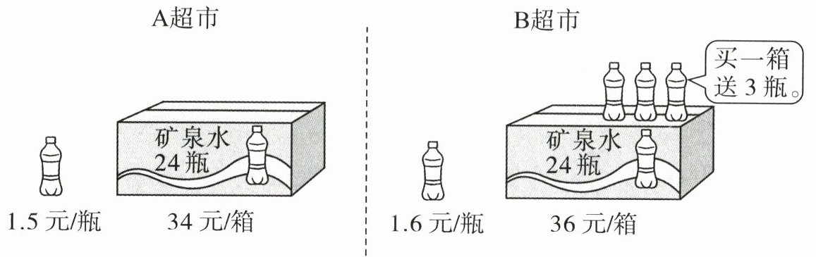 A超市:34+(30-24)×1.5=43(元) B超市:30-3-24=3(瓶) 36+1.6×3=40.8(元) 43元>40.8元 B超市便宜,一共需要40.8元。