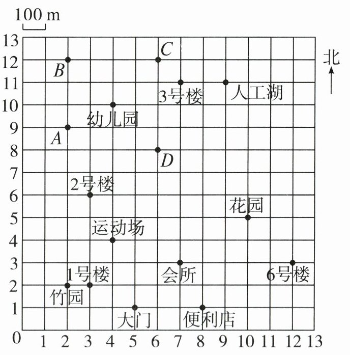 1. 便利店(8,1) 人工湖(9,11) 花园(10,5) 运动场(4,4) 竹园(2,2) 会所(7,3)
