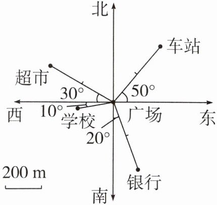 (1) 过山车在水上乐园南偏东 $30^{\circ}$ 方向 200 m 处。
