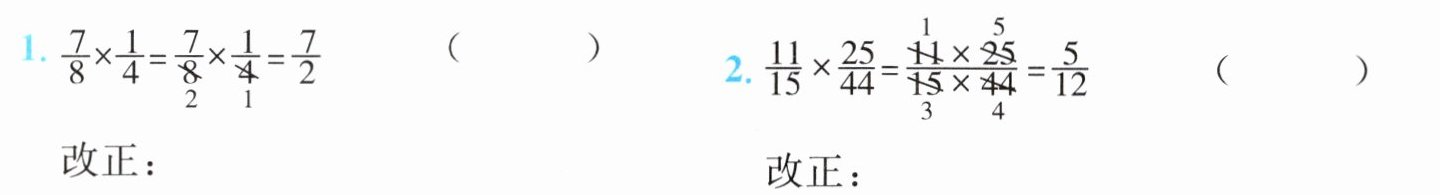 1. × 改正:$\frac{7}{8}×\frac{1}{4}=\frac{7×1}{8×4}=\frac{7}{32}$ 2. √