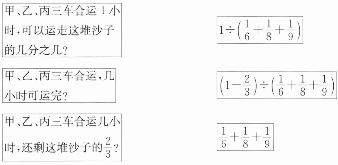 一堆沙子,甲车单独运完要6小时,乙车单独运完要8小时,丙车单独运完要9小时。