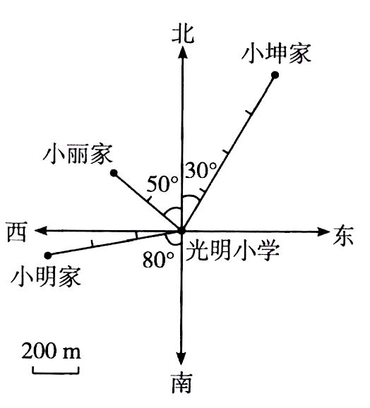 (2) 小明家的位置在南偏西 $80^{\circ}$ 方向上,距离光明小学有 $600$ m。
