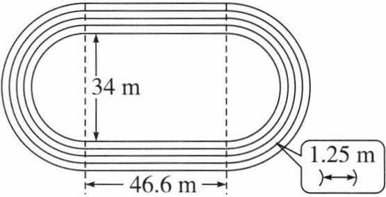 46.6×2+3.14159×(34+1.25×2)≈207.87(m) 46.6×2+3.14159×(34+1.25×2+1.25×2)≈215.72(m) 46.6×2+3.14159×(34+1.25×2+1.25×2+1.25×2)≈223.58(m) 207.87-200.01=7.86(m) 215.72-207.87=7.85(m) 223.58-215.72=7.86(m) 答:各跑道的长约相差(7.86)m。