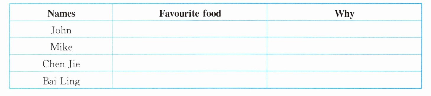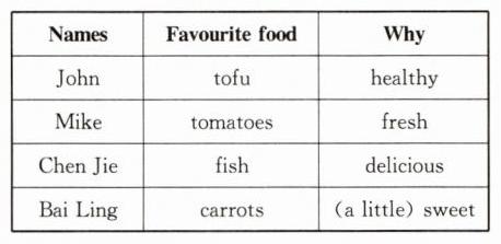 John: My favourite food is tofu, because it's healthy. I don't like tomatoes. I think they are sour.