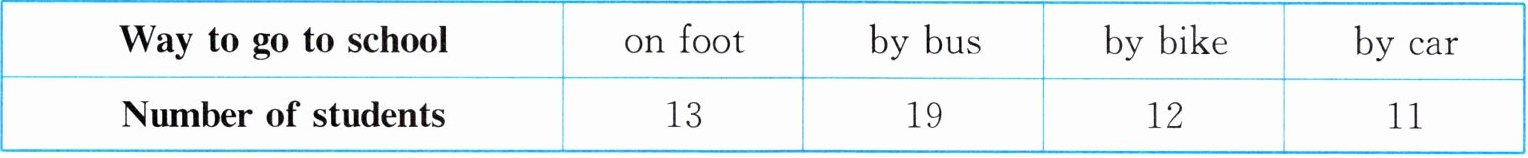 One possible version:There are fifty-five students in our class. We go to school in different ways. Thirteen students go to school on foot. Nineteen go by bus. Twelve students go to school by bike. And eleven go by car.