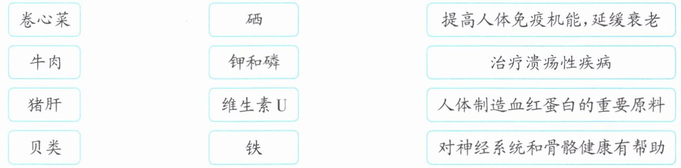 判断下列食物富含哪些营养元素及对人体具有怎样的作用,请用线连一连。