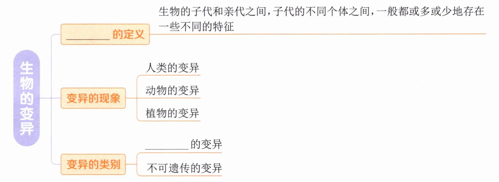 的定义:生物的子代和亲代之间,子代的不同个体之间,一般都或多或少地存在一些不同的特征 ├─ 变异的现象