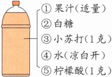 )。 ①果汁(适量)②白糖③小苏打(1克)④水(凉白开)⑤柠檬酸(1克)