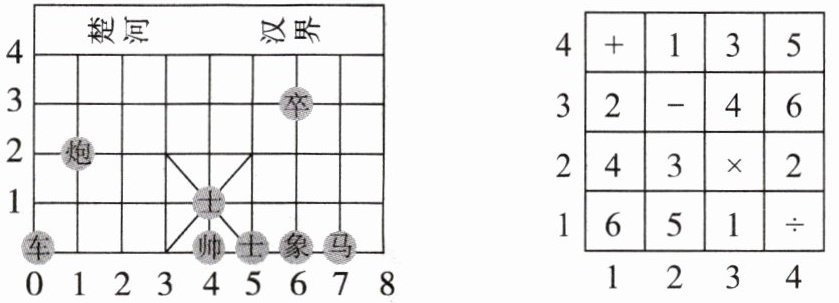 (1)下面左图是中国象棋棋盘的一部分。如果“帅”的位置用数对表示是(4,0),那么“炮”的位置用数对表示是(