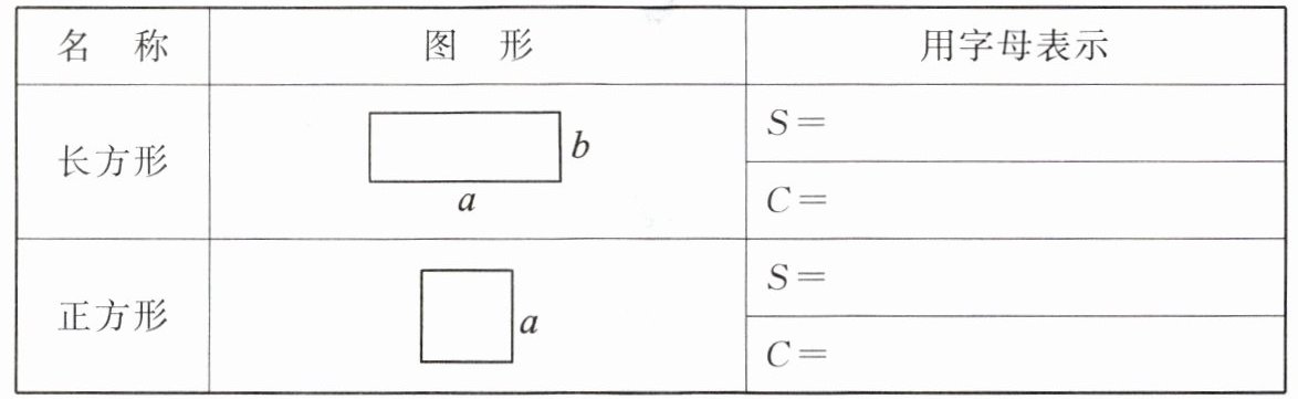 (1)长方形:S=ab C=2(a+b) 正方形:S=$a^{2}$ C=4a