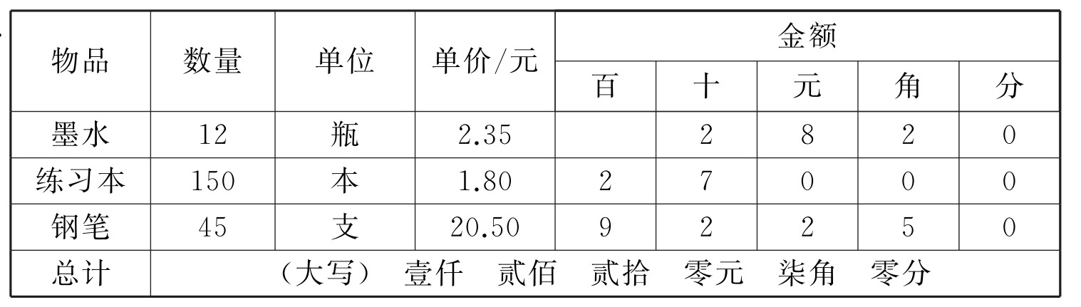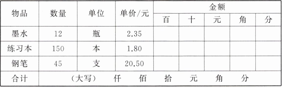 4.先计算下面每种文具用品的金额,填在表格中;再算出合计的总金额,并用大写数字填写在表格中。(大写数字:零、壹、贰、叁、肆、伍、陆、柒、捌、玖、拾。)