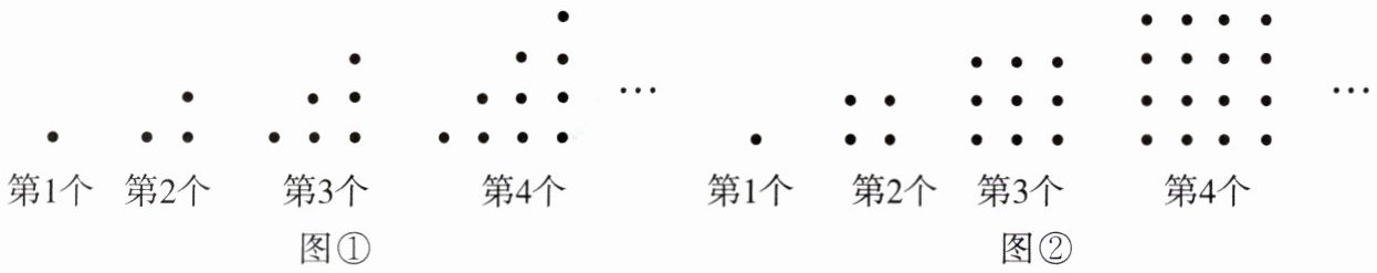 古希腊著名的哲学家、数学家毕达哥拉斯常在沙滩上摆小石子表示数,产生了一系列的形数. 如图①,当小石子的个数是 $ 1,3,6·s $ 时,小石子能摆成三角形,这些数叫三角形数. 如图②,当小石子的个数是 $ 1,4,9·s $ 时,小石子能摆成正方形,这些数叫正方形数.