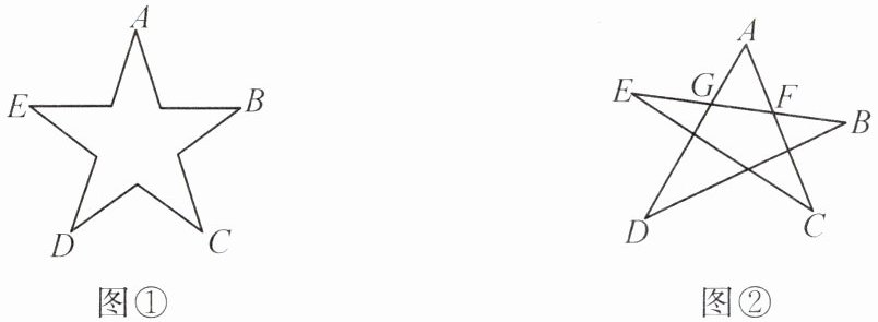 例 1 如图①,规则五角星的五个角的度数都相等,都是36°,所以这五个角的和∠A + ∠B + ∠C + ∠D + ∠E = 180°。如图②,不规则五角星的五个角的度数显然不一定都相等,但五个角的和∠A + ∠B + ∠C + ∠D + ∠E仍为180°,你知道这是为什么吗?