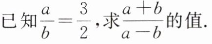 解:设 $ a = 3k$,$ b = 2k(k \neq 0)$,代入 $\frac{a + b}{a - b}$,得原式 $ = \frac{3k + 2k}{3k - 2k} = \frac{5k}{k} = 5$。