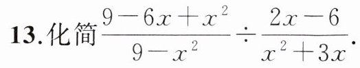 13. 化简$\frac{9 - 6x + x^2}{9 - x^2} ÷ \frac{2x - 6}{x^2 + 3x}$。