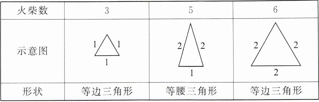 (2)8 根火柴能搭成 1 种三角形,其三边分别为 3,3,2;