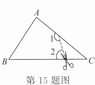 15. 如图,在 $\triangle ABC$ 中,$\angle C = 40^{\circ}$,按图中虚线将 $\angle C$ 剪去后,$\angle 1 + \angle 2$ 的度数为