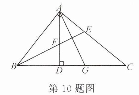 10. 如图,在 $\triangle ABC$ 中,$\angle BAC = 90^{\circ}$,$AD\perp BC$,$\angle ABC$ 的平分线 $BE$ 交 $AD$ 于点 $F$,$AG$ 平分 $\angle DAC$。有下列结论:① $\angle BAD = \angle C$;② $\angle AEF = \angle AFE$;③ $\angle EBC = \angle C$;④ $AG\perp EF$。其中正确的结论是(