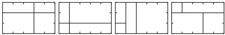 (1) 请你在图①至图④中, 分别用四种方法把长和宽分别为 5 和 3 的矩形分成四个均不全等的小矩形或正方形, 且小矩形或正方形的各边长均为整数.