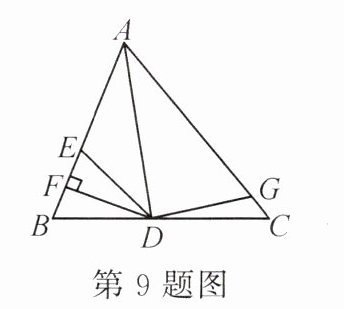 9. 如图,$AD$是$\triangle ABC$的角平分线,$DF\perp AB$,垂足为$F$,$DE = DG$,$\triangle ADG$和$\triangle AED$的面积分别为$50$和$39$,则$\triangle EDF$的面积为(