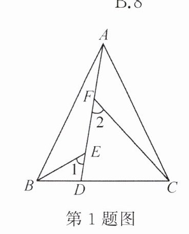 1. 如图,在$\triangle ABC$中,$AB = AC$,$AB>BC$,点$D$在边$BC$上,$CD = 2BD$,点$E$,$F$在线段$AD$上,$\angle 1=\angle 2=\angle BAC$,若$\triangle ABC$的面积为$18$,则$\triangle ACF$与$\triangle BDE$的面积之和是(