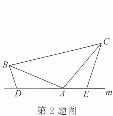 2. 如图,在$\triangle ABC$中,$AB = AC$,$D$,$A$,$E$三点都在直线$m$上,且$\angle BDA=\angle AEC=\angle BAC$,$BD = 3$,$CE = 6$,则$DE$的长度为