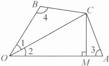 2. 如图,在四边形 $OACB$ 中,$CM\perp OA$,垂足为 $M$,$\angle 1 = \angle 2$,$\angle 3+\angle 4 = 180^{\circ}$。